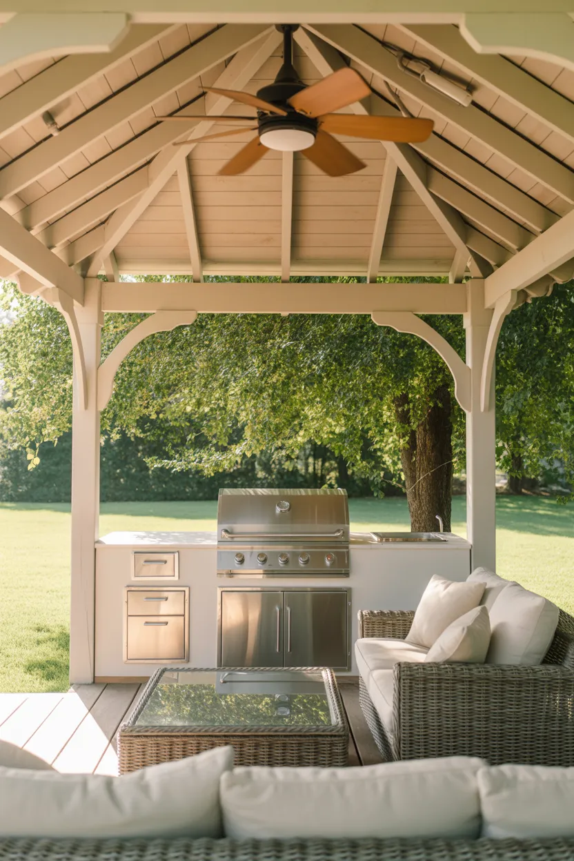 A ceiling fan inside the gazebo helps keep the space comfortable during hot weather. It improves airflow, makes guests feel better, and gives the cooking area a much less stuffy feel.