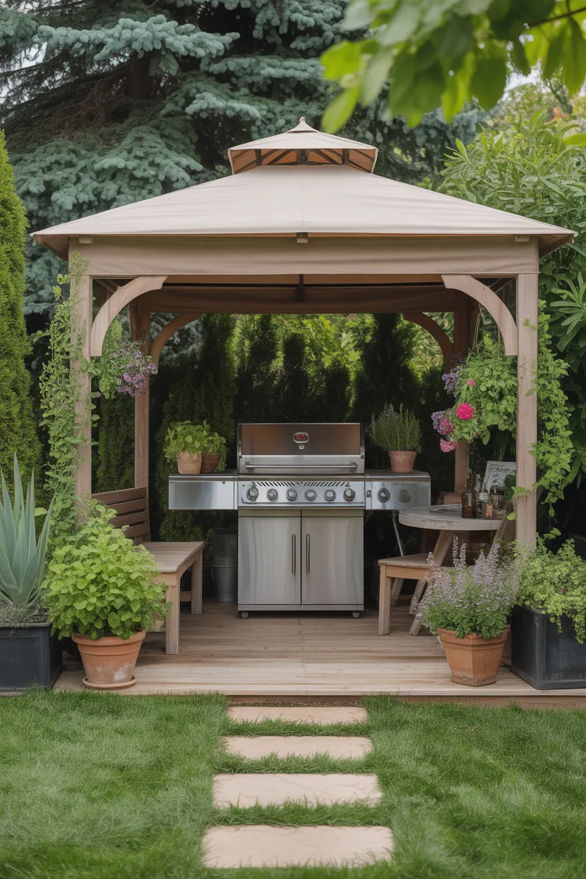 Adding plants and greenery around your BBQ gazebo softens the structure and helps it feel connected to the rest of the yard. This detail matters because even the nicest gazebo can look a little stiff if it sits in a totally bare space.