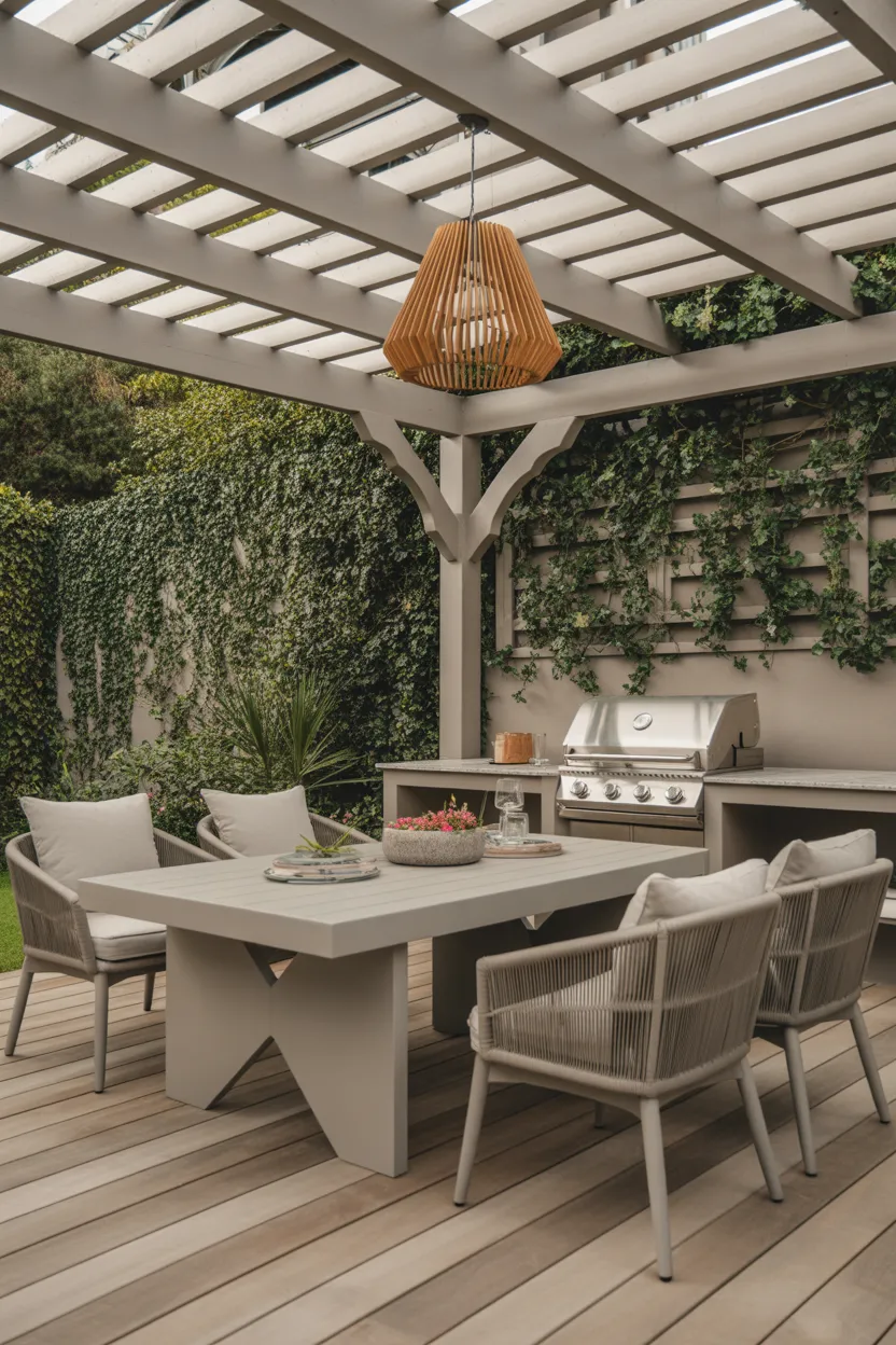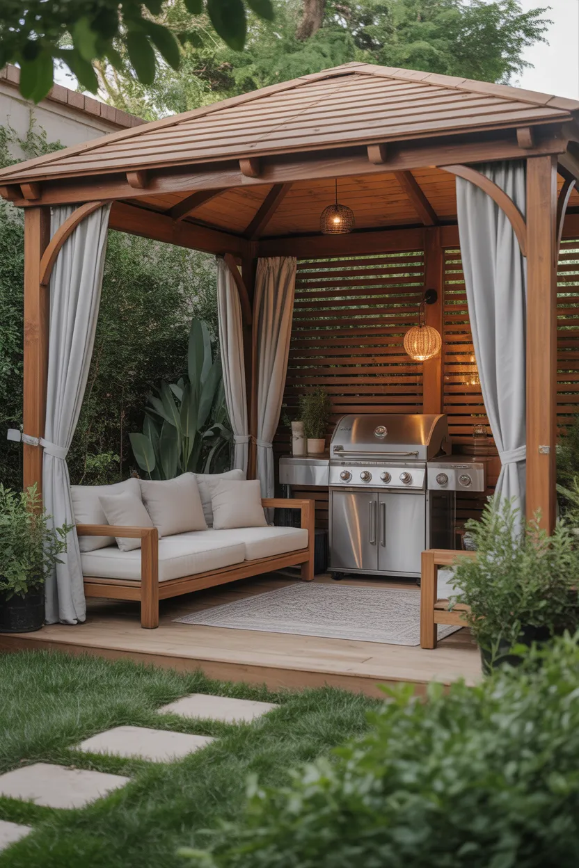A pergola style gazebo creates a lighter, more open look while still defining the BBQ area. It works well for people who want some structure without making the space feel closed in.