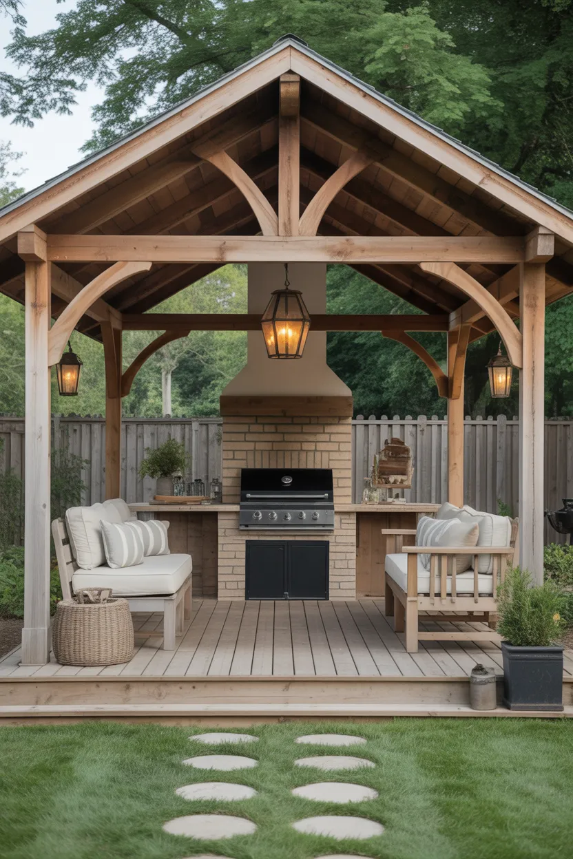 A rustic wooden gazebo brings warmth and charm to a BBQ area. It feels relaxed, cozy, and naturally inviting. If you like spaces that feel lived in rather than too polished, this style makes a lot of sense.