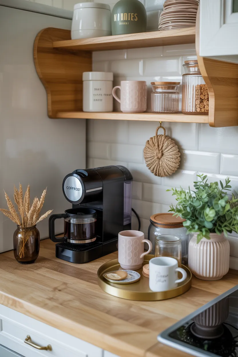 You do not need a huge amount of space for this. A section of countertop, a floating shelf, or a small cart can work beautifully. Add your favorite mugs, a pretty container for sugar or pods, and maybe a small lamp if the layout allows it.