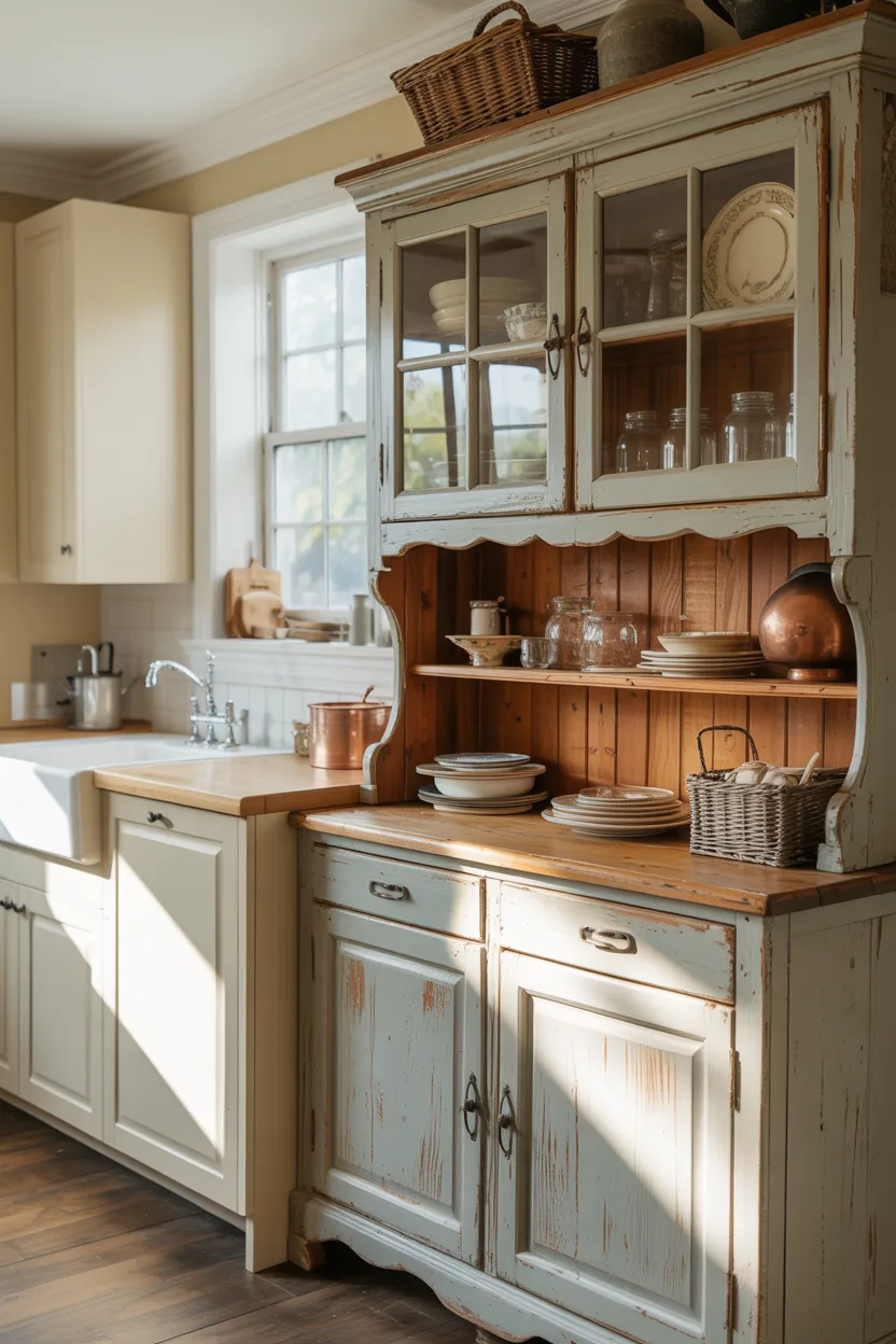 A freestanding furniture piece gives the kitchen more personality. A vintage hutch, old worktable, painted cabinet, or narrow dresser can break up the fitted look and make the room feel layered. That little change often makes a kitchen feel more like part of the home and less like a sealed-off work zone.
