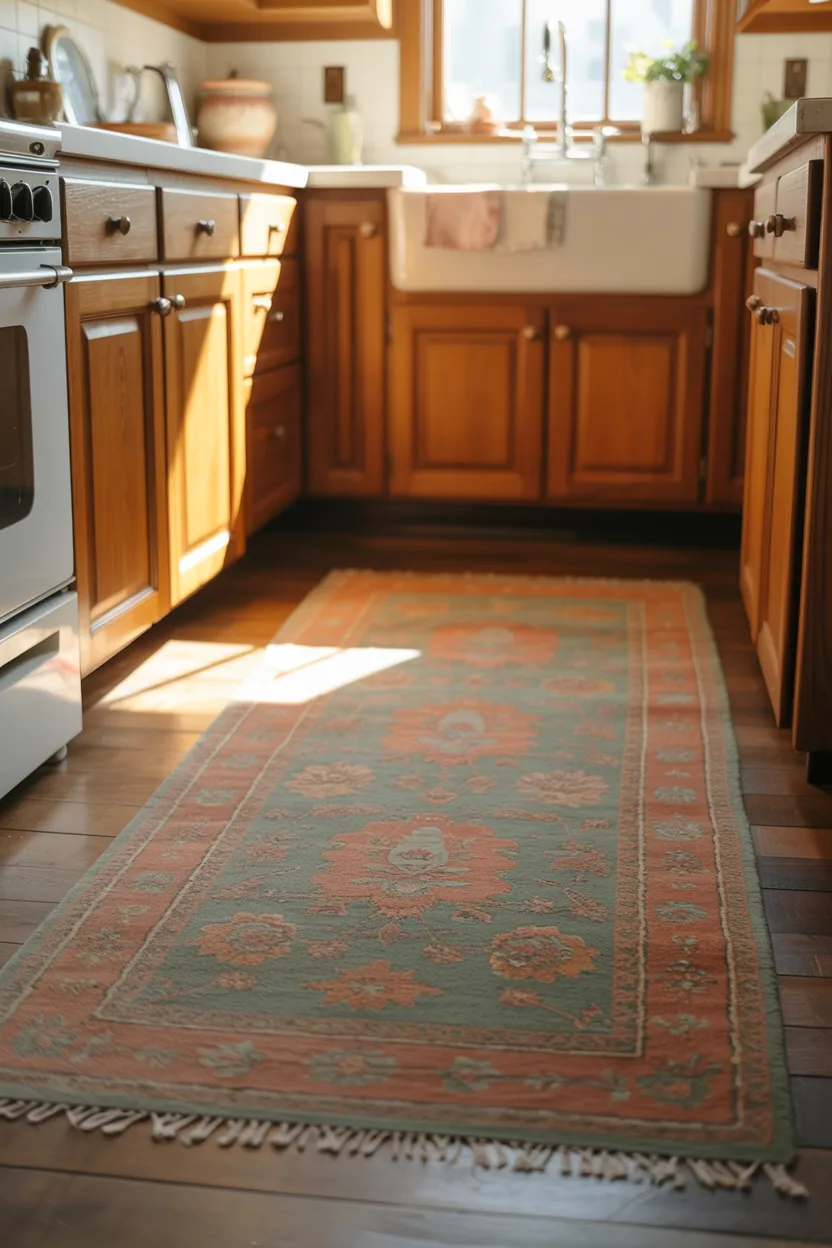 A rug can change the energy of a kitchen almost instantly. It adds softness, color, pattern, and comfort, especially in a room full of hard surfaces. A vintage-style runner or washable woven rug can make the space feel much warmer and more finished.