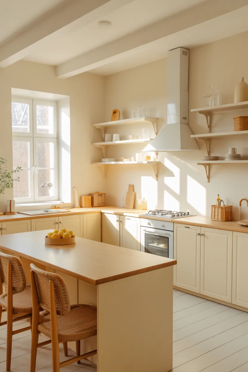 Wall color changes everything faster than people expect. Bright white can make a kitchen feel clean, but it can also make it feel cold and a little too sharp. Creamy white, soft ivory, and warm off-white shades keep the room bright while adding a much gentler atmosphere.