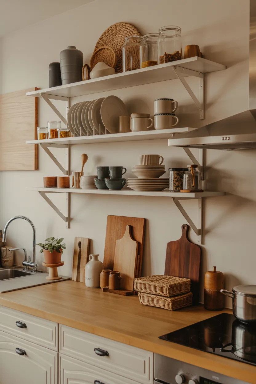 The key here is balance. You want the shelves to feel useful and easy, not crowded. A few stacks of plates, one or two ceramic pieces, and some glass jars usually look better than trying to display everything you own. Your kitchen is not a storage unit with mood lighting.