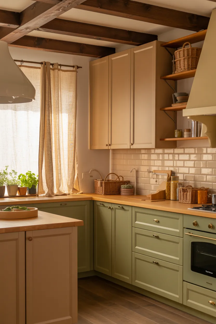Earthy colors create instant comfort. Soft green, warm taupe, clay, mushroom, muted blue, and sandy beige all give a kitchen a grounded, welcoming feel. These shades connect the room to nature, which makes the space feel calmer and easier to live in.
