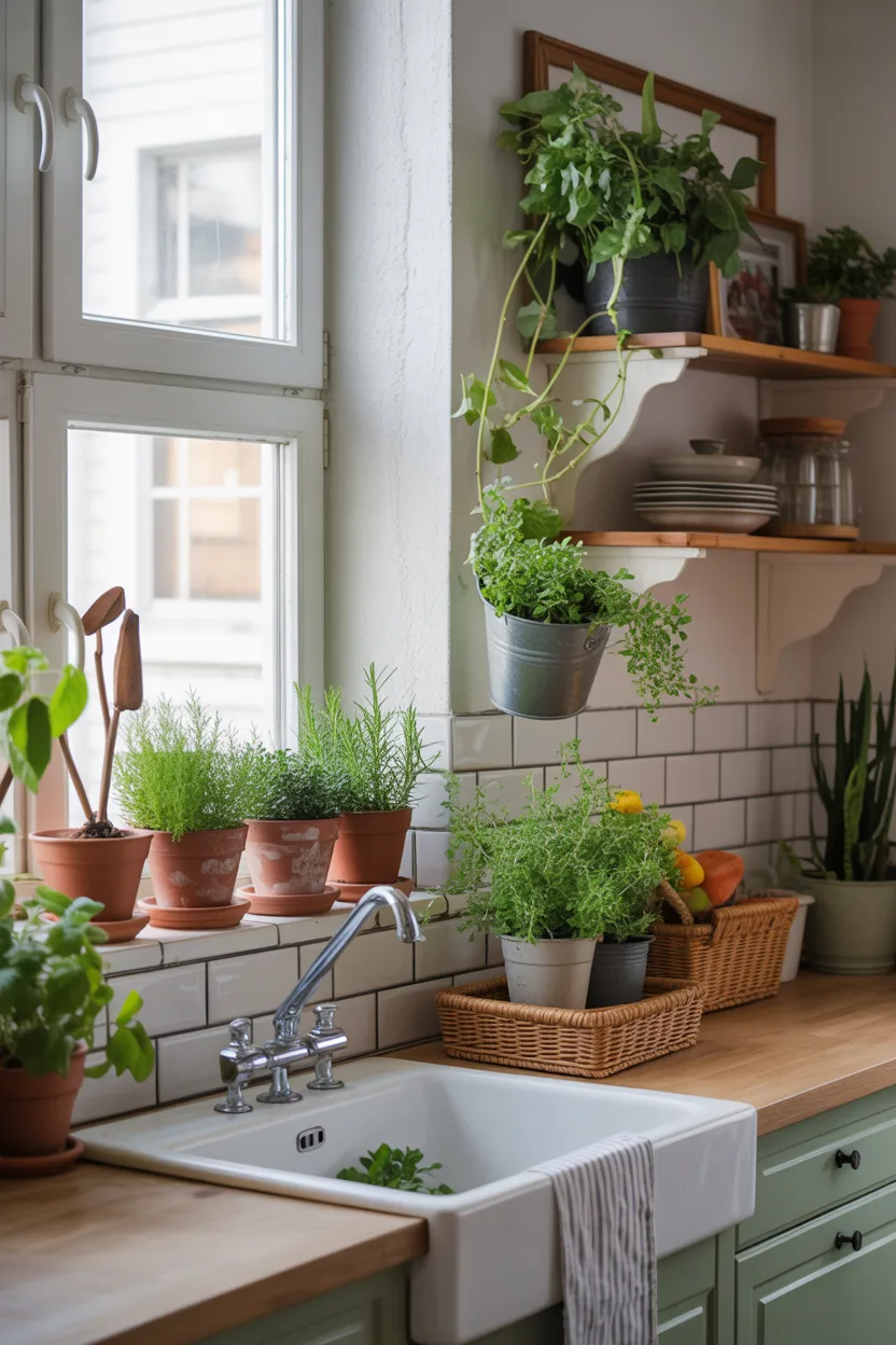 Plants instantly make a kitchen feel more alive. A small herb pot on the windowsill, trailing greenery on a shelf, or fresh branches in a ceramic vase can add color and softness with almost no effort. That little bit of life changes the mood of the room fast.