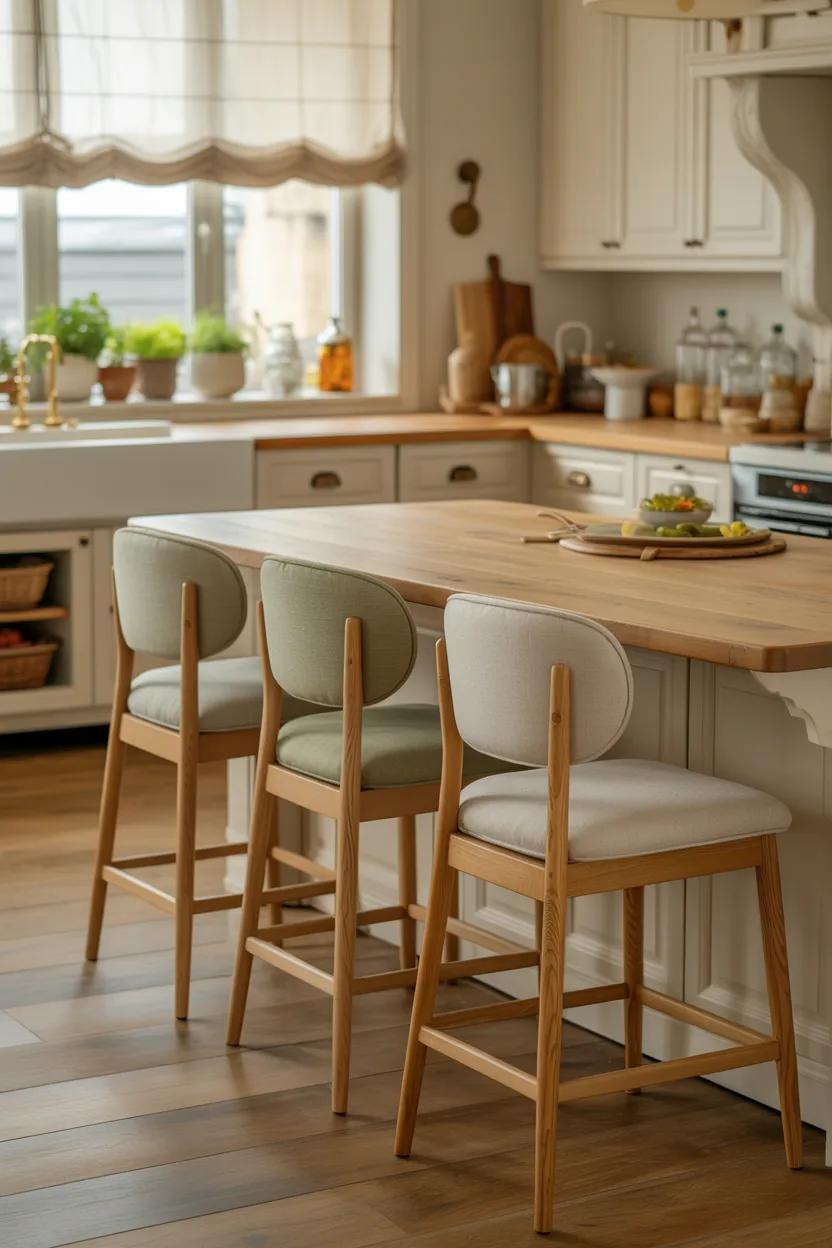 Matching every seat in the kitchen can look polished, but mixed seating often feels more natural and relaxed. You might pair wood dining chairs with upholstered counter stools or use stools in slightly different finishes that still work together. That small variation adds personality.