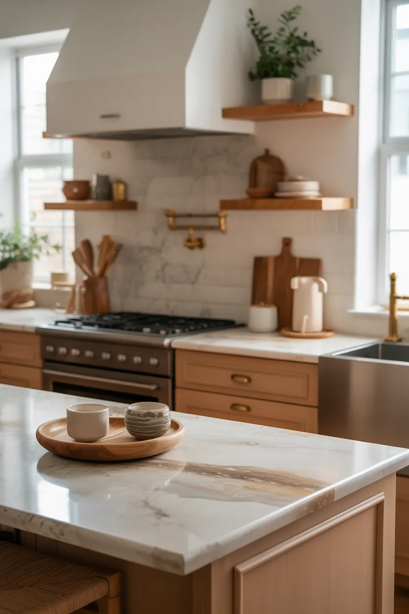 Natural stone brings quiet luxury into a kitchen, but the finish matters. Honed stone and softly textured surfaces feel warmer and more relaxed than high-gloss slabs. They give the room an organic quality that suits cozy design perfectly.