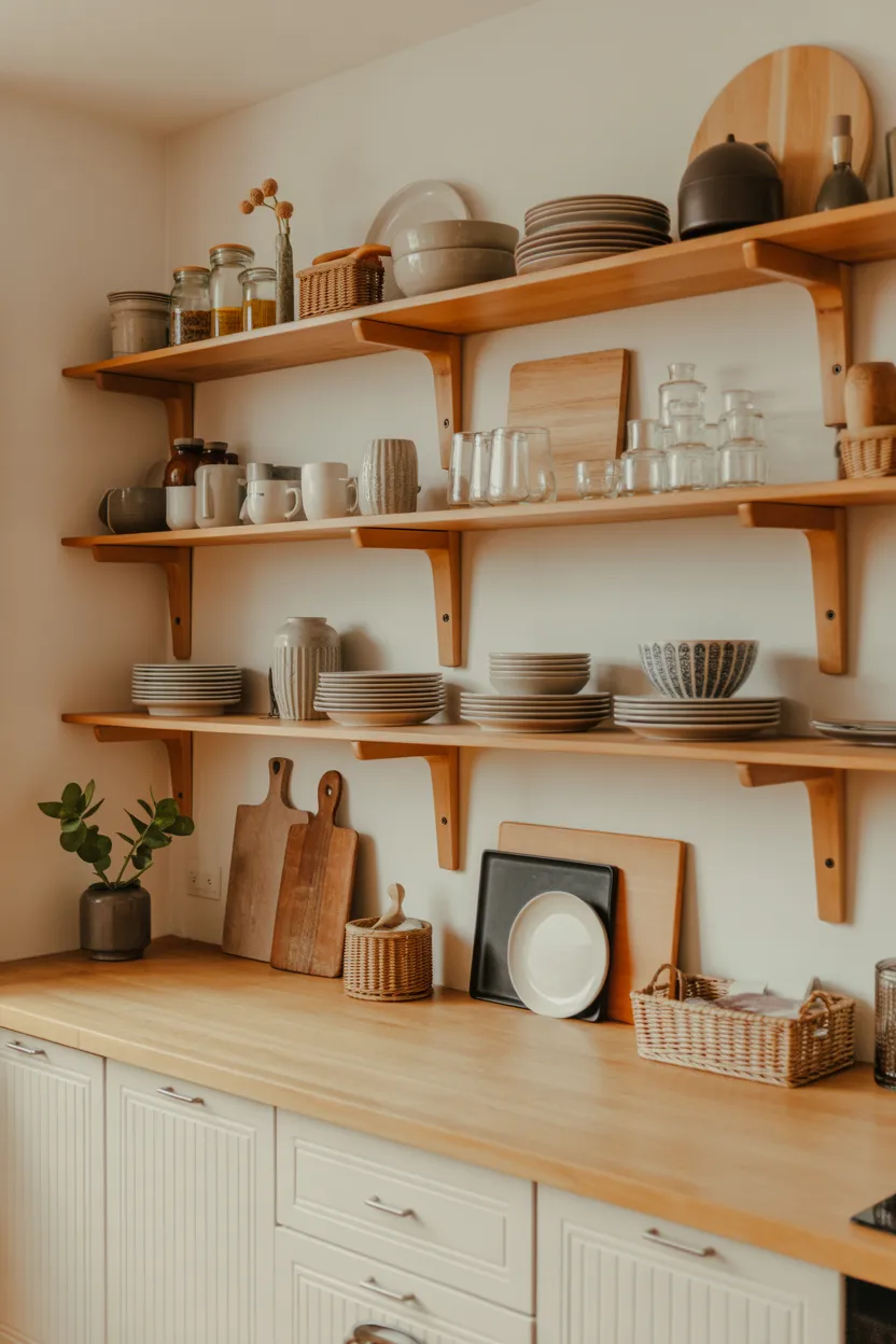 3. Open Wooden Shelves for a Collected, Lived-In Look