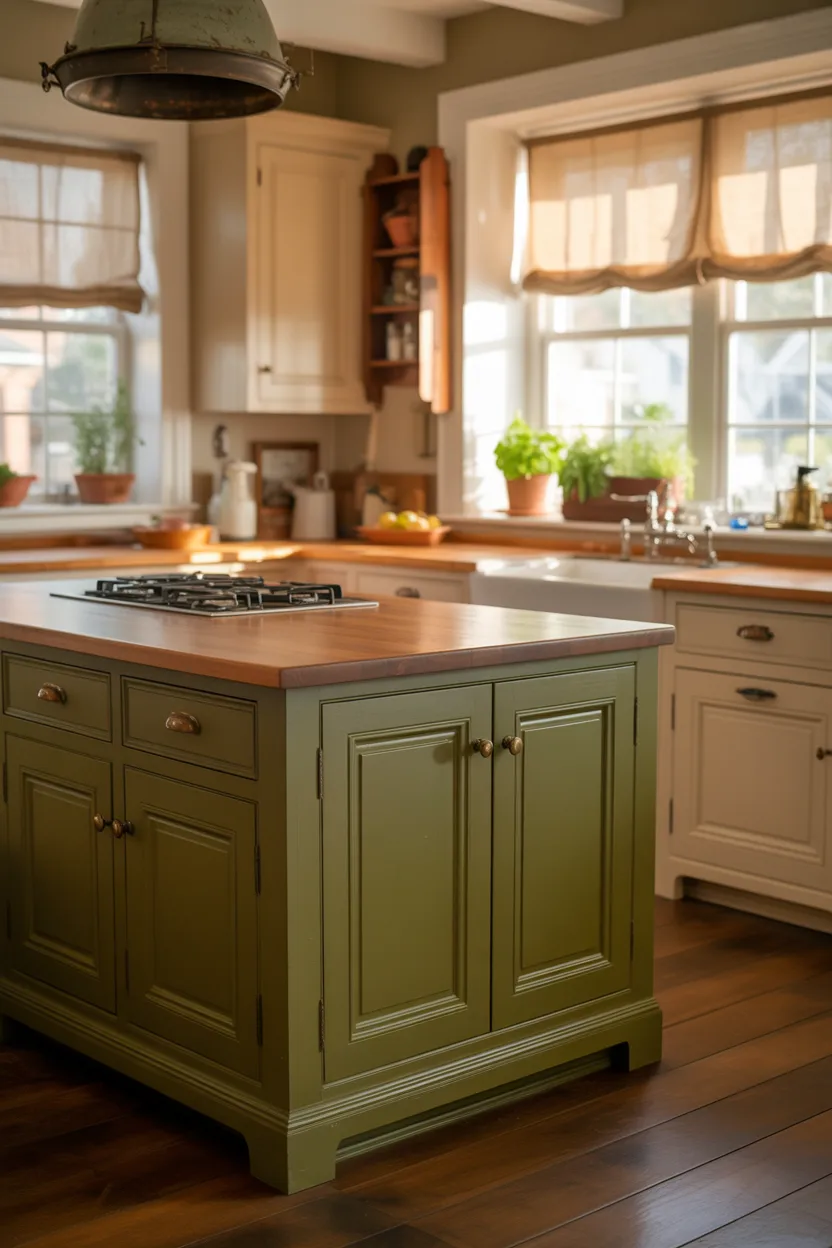 A painted island adds depth without overwhelming the room. Warm, moody shades like olive green, charcoal brown, deep navy, muted clay, or gray-green create contrast while still keeping the kitchen cozy. These colors ground the space and make the layout feel richer.