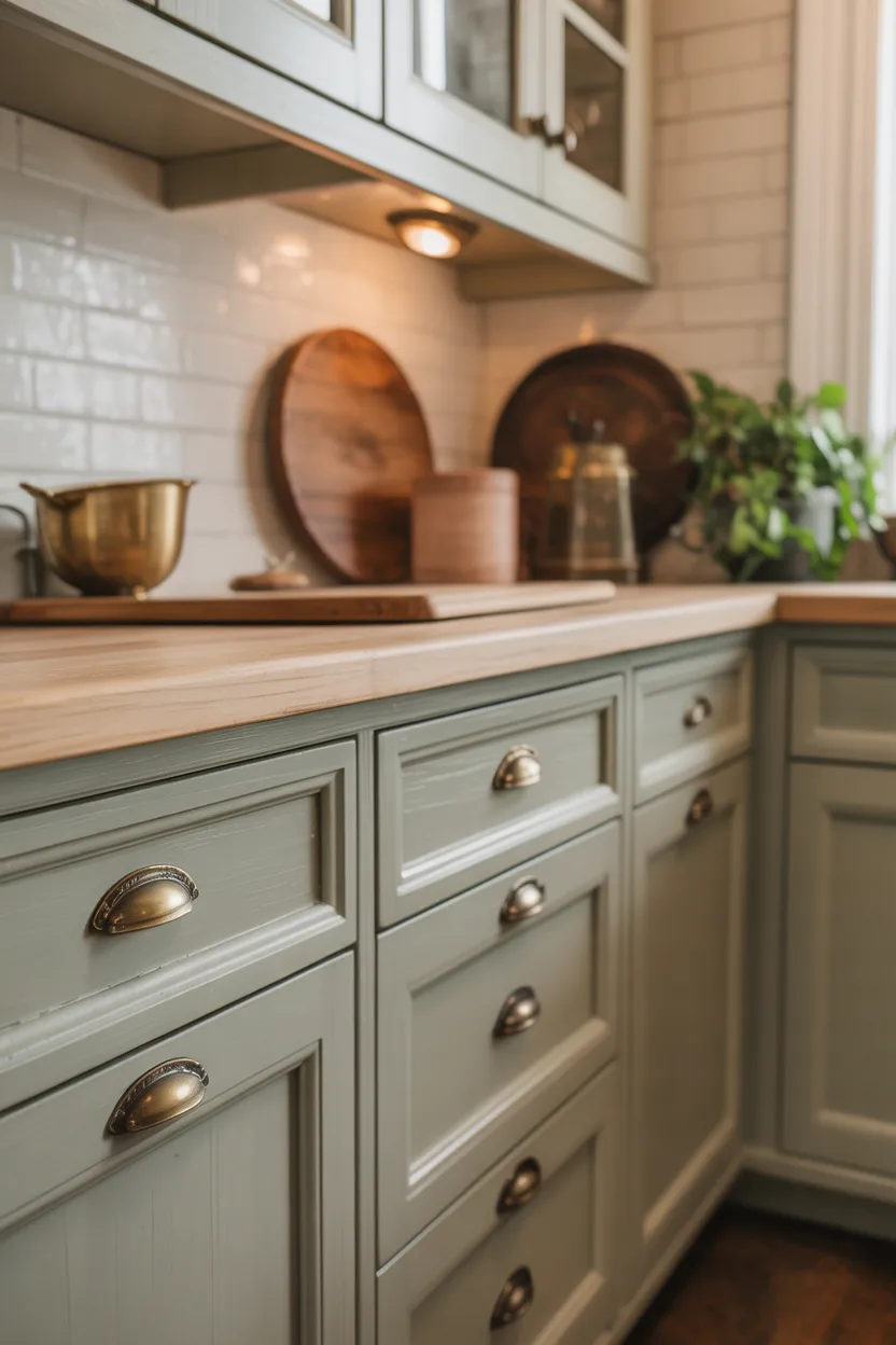 Hardware may seem like a small detail, but it changes the personality of the kitchen in a huge way. Vintage-inspired knobs and pulls add warmth, charm, and a little history. Brass, antique bronze, aged nickel, and old-style iron all create a softer, more lived-in feeling.