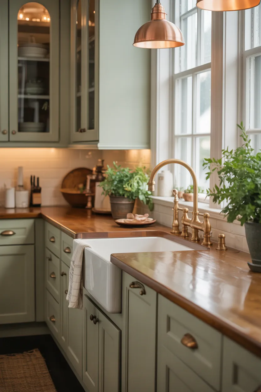 I have always liked warm green kitchens because they feel fresh without looking cold. Pair that color with wood tones and soft lighting, and the room feels balanced right away. It looks stylish, but it also feels peaceful.