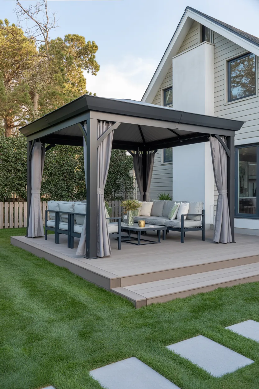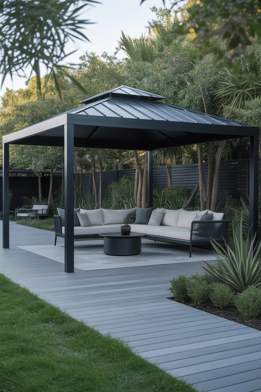 If you want a backyard that feels updated and slightly upscale, this idea delivers. A black gazebo with gray decking creates a bold modern look that feels stylish, clean, and expensive.