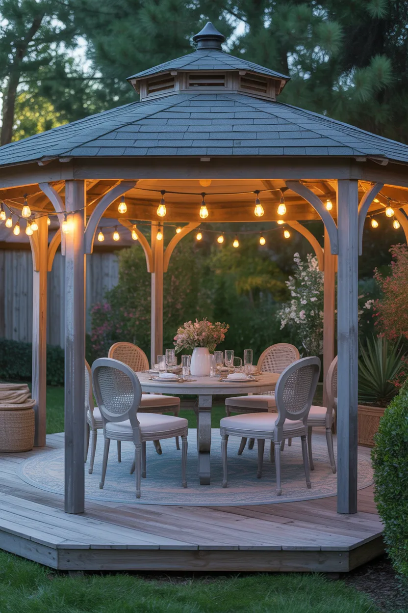 Use soft warm bulbs rather than harsh bright ones if you want that relaxed atmosphere. String lights make a gazebo deck feel warm, charming, and beautifully inviting after sunset.