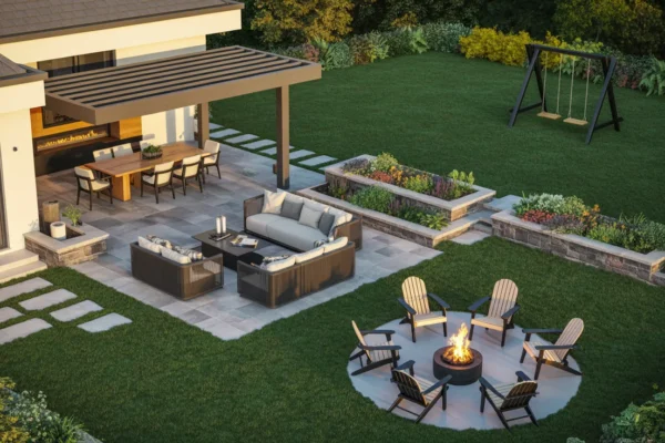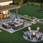 Keep the fire pit at a safe distance and use materials around it that can handle heat and traffic. A stone or gravel surround often works well. You want the spaces to feel connected, but you also want them to function safely and comfortably.