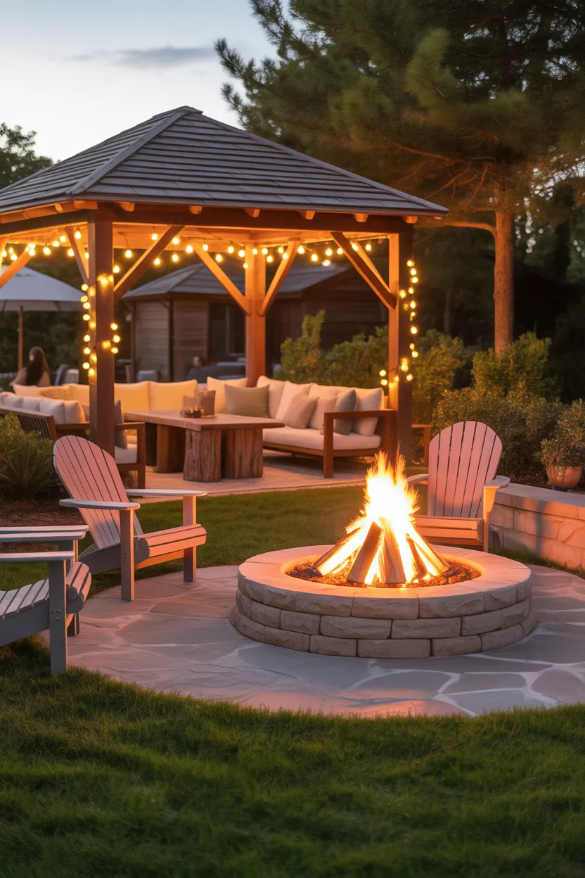 A fire pit near the gazebo deck creates one of the best backyard combinations. You get covered comfort inside the gazebo and open air warmth just outside it. That gives the space more variety and makes it useful across more seasons.