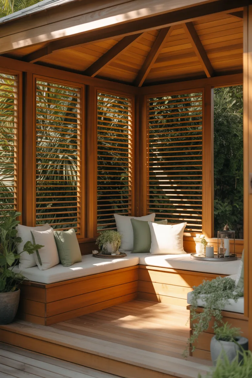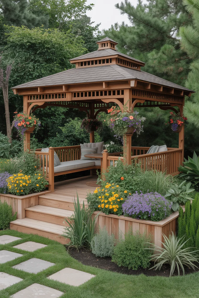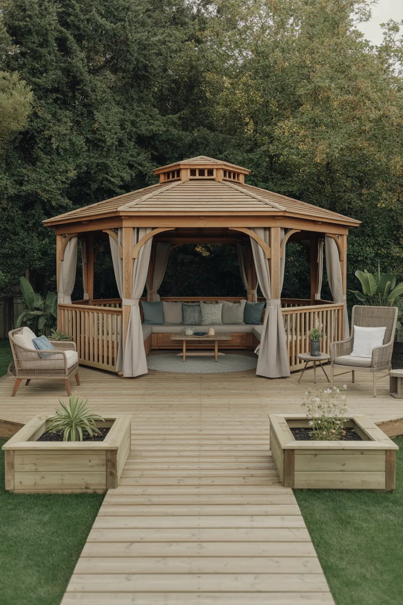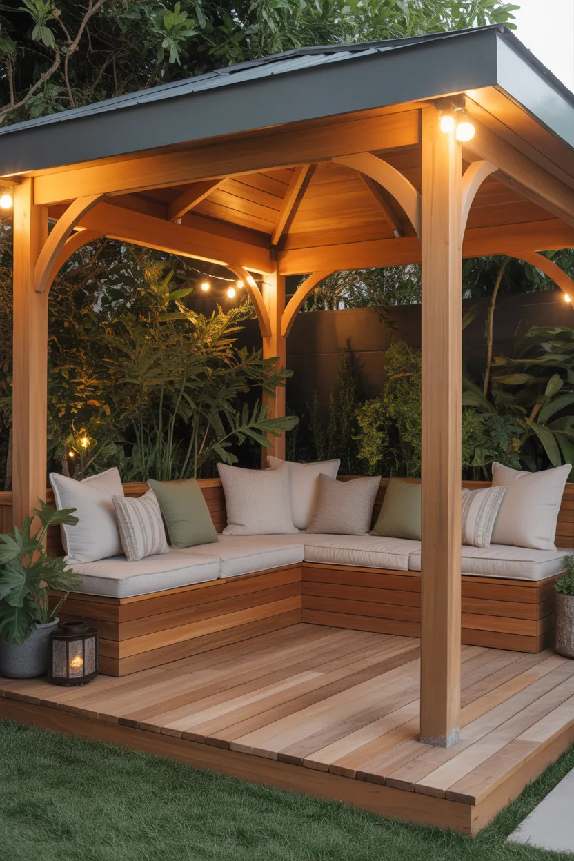This idea works really well in smaller backyards where every inch matters. You can line the edges of the deck or tuck seating inside the gazebo itself. That gives you comfortable places to sit without cluttering the floor plan. And honestly, cluttered outdoor spaces lose their charm fast.