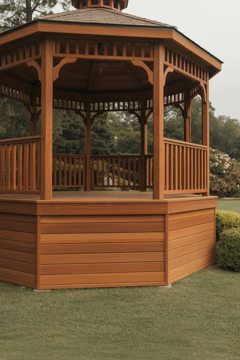 You can keep the look rustic, classic, or slightly modern depending on the stain and gazebo style you choose. Lighter wood tones feel airy, while darker stains look richer and a bit more dramatic. Natural wood gives a gazebo deck warmth, character, and a look that stays attractive year after year.