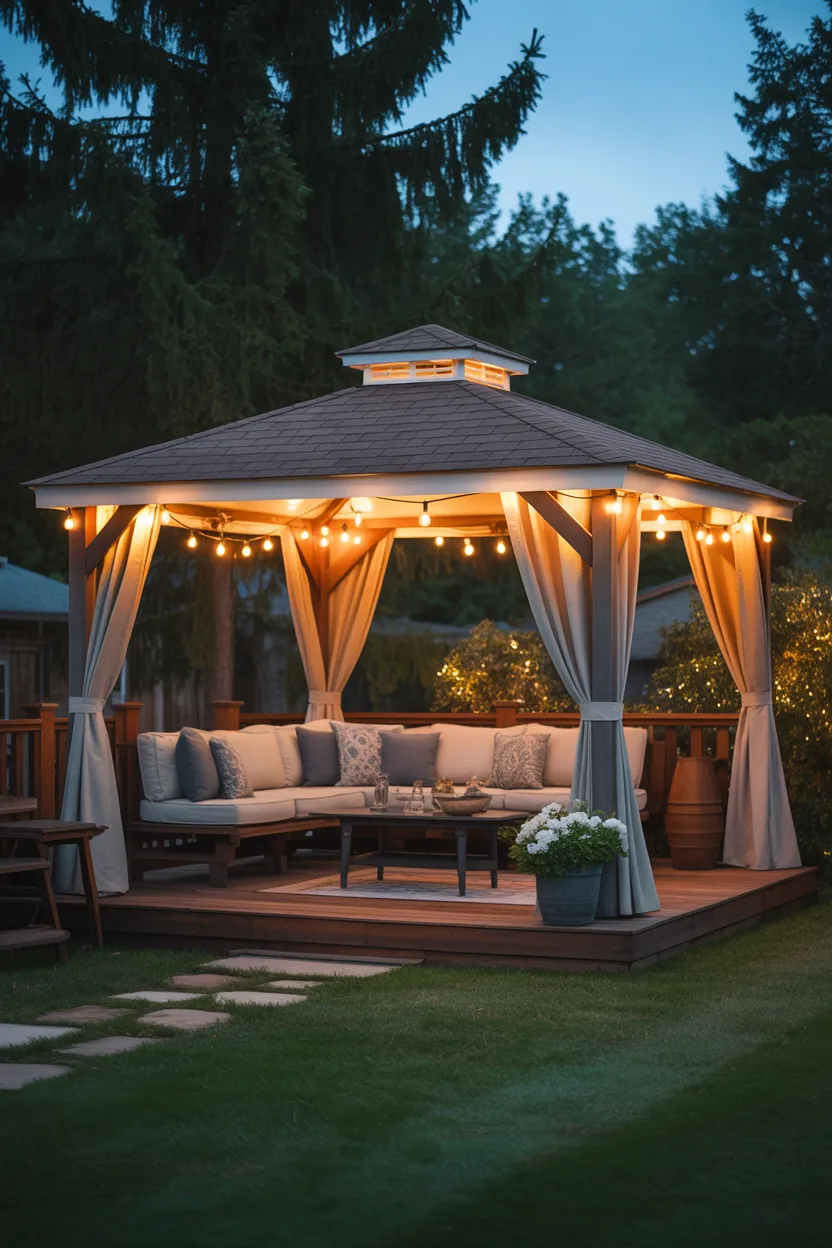 To make the space feel extra inviting, use cushions, lanterns, and soft lighting. A cozy lounge gazebo deck creates comfort, style, and a relaxed backyard atmosphere that works day or night.