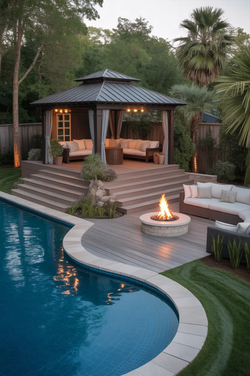 This idea makes evenings feel more special. A nearby fire pit adds warmth, atmosphere, and a second social zone to a gazebo deck setup.