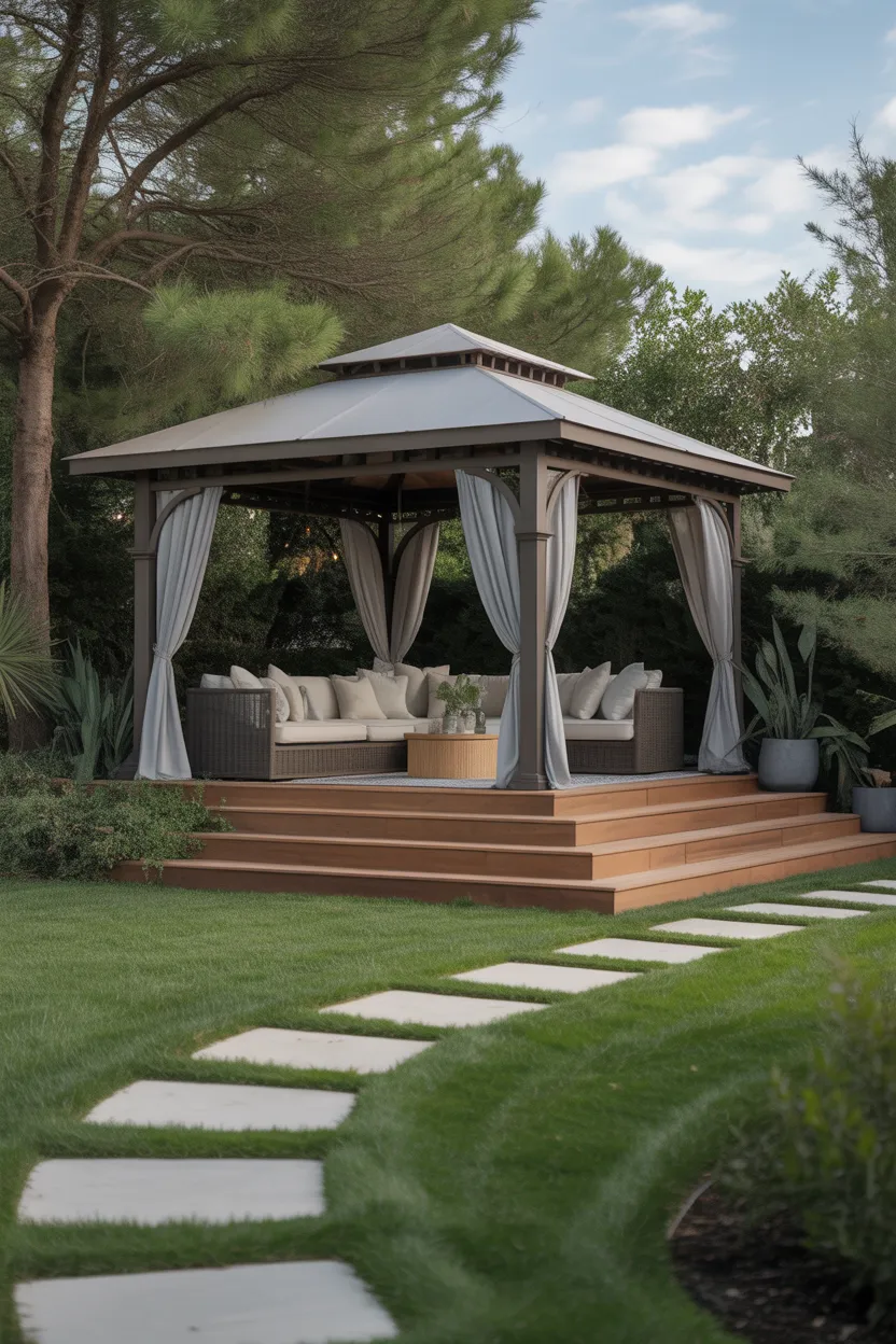 This works especially well in larger or sloped backyards. One level can hold the gazebo, while another can support a lounge area, a grill zone, or even a small fire pit section. That separation makes the backyard feel larger because each area has its own purpose.