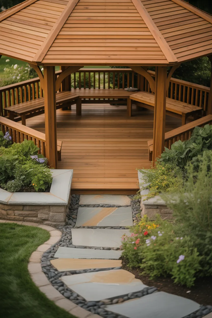 Wood and stone create a beautiful contrast in outdoor spaces. Wood brings warmth, while stone adds texture and weight. Together, they make a gazebo deck feel more layered and professionally styled.