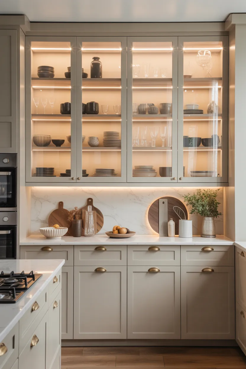 Glass-front cabinets break up solid cabinetry and make the room feel more open. They add visual relief, which helps in kitchens with a lot of cabinet space. Even a few glass panels can change the whole balance of the room.