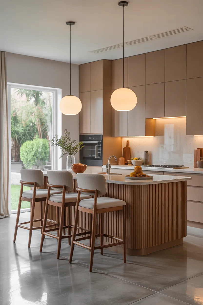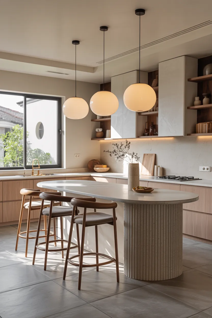 You can bring curves in through stools, pendant lights, decorative bowls, arched niches, or even a rounded island edge. Those softer forms break up the geometry and make the room feel more welcoming. The result feels stylish without feeling too severe.