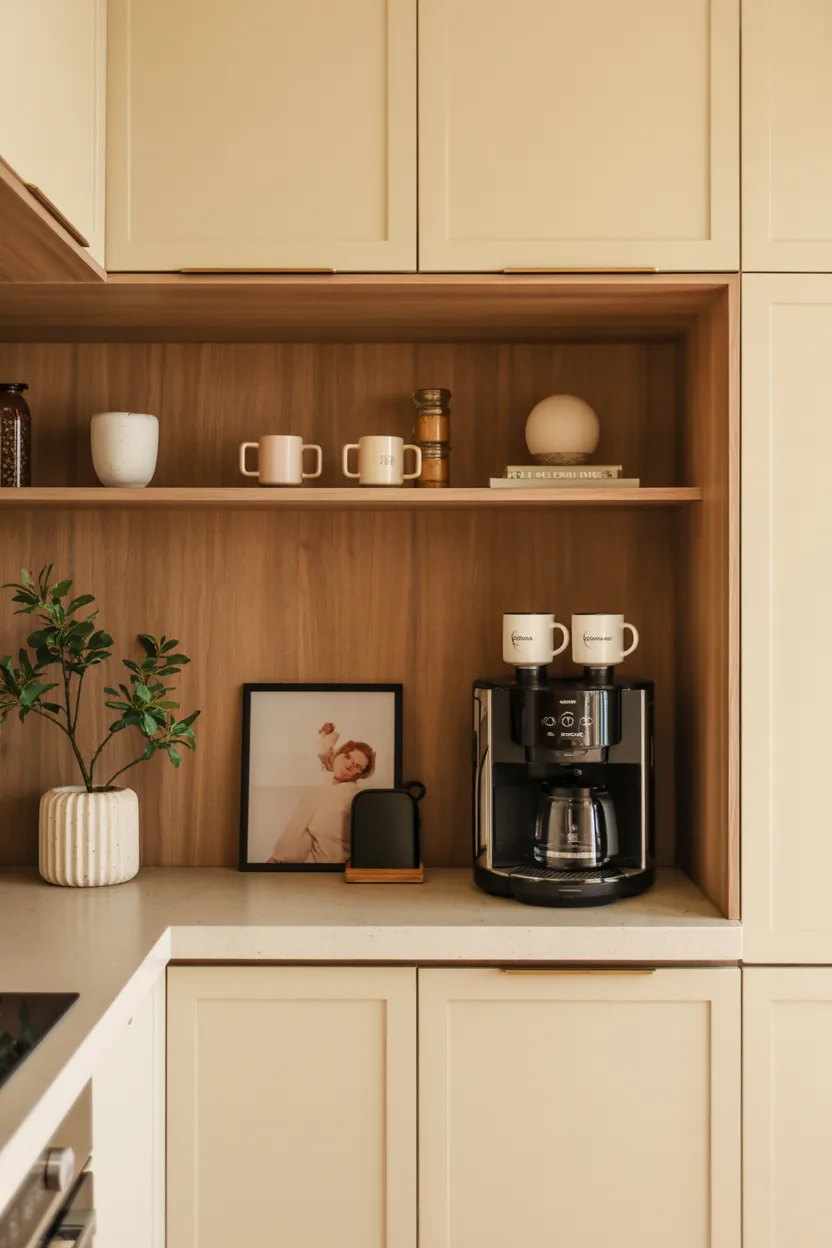 A built-in coffee station makes daily life easier and makes the kitchen feel more thoughtful. It gives your mugs, machine, beans, and extras a dedicated place. That keeps the main counters cleaner and turns your routine into something a little nicer.