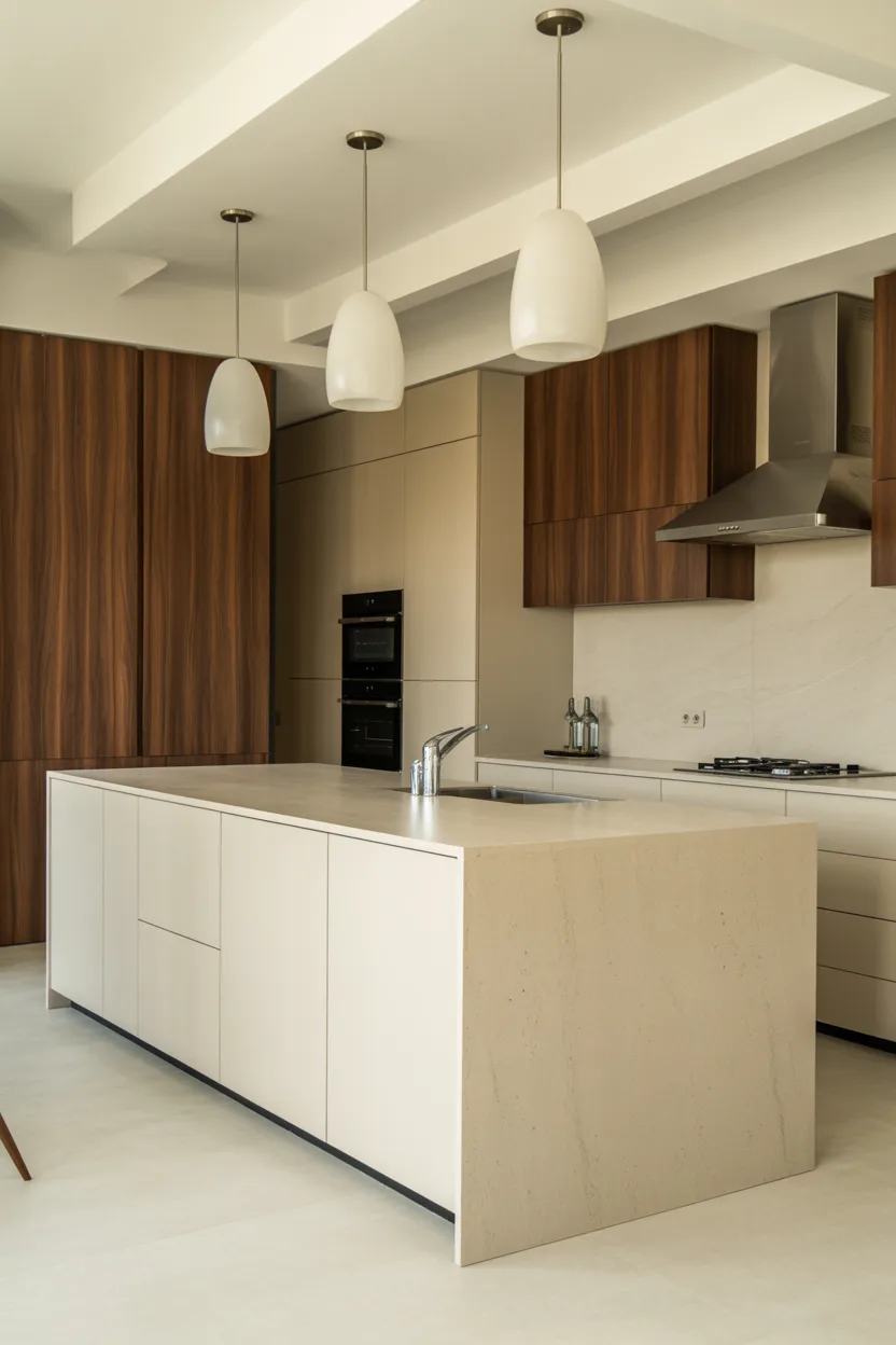 A waterfall island always adds a strong modern look. The stone runs down the sides, so the island feels more sculptural and seamless. It gives the kitchen a clean focal point without adding visual clutter.