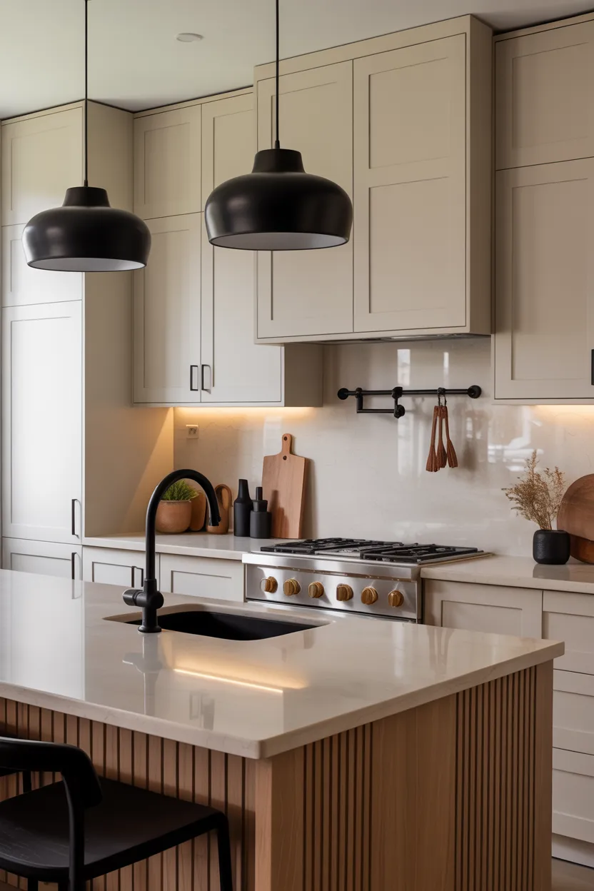 A little black can make a warm kitchen look more defined. It adds contrast, sharpens the design, and helps lighter finishes stand out. Without contrast, a soft kitchen can start to look washed out.