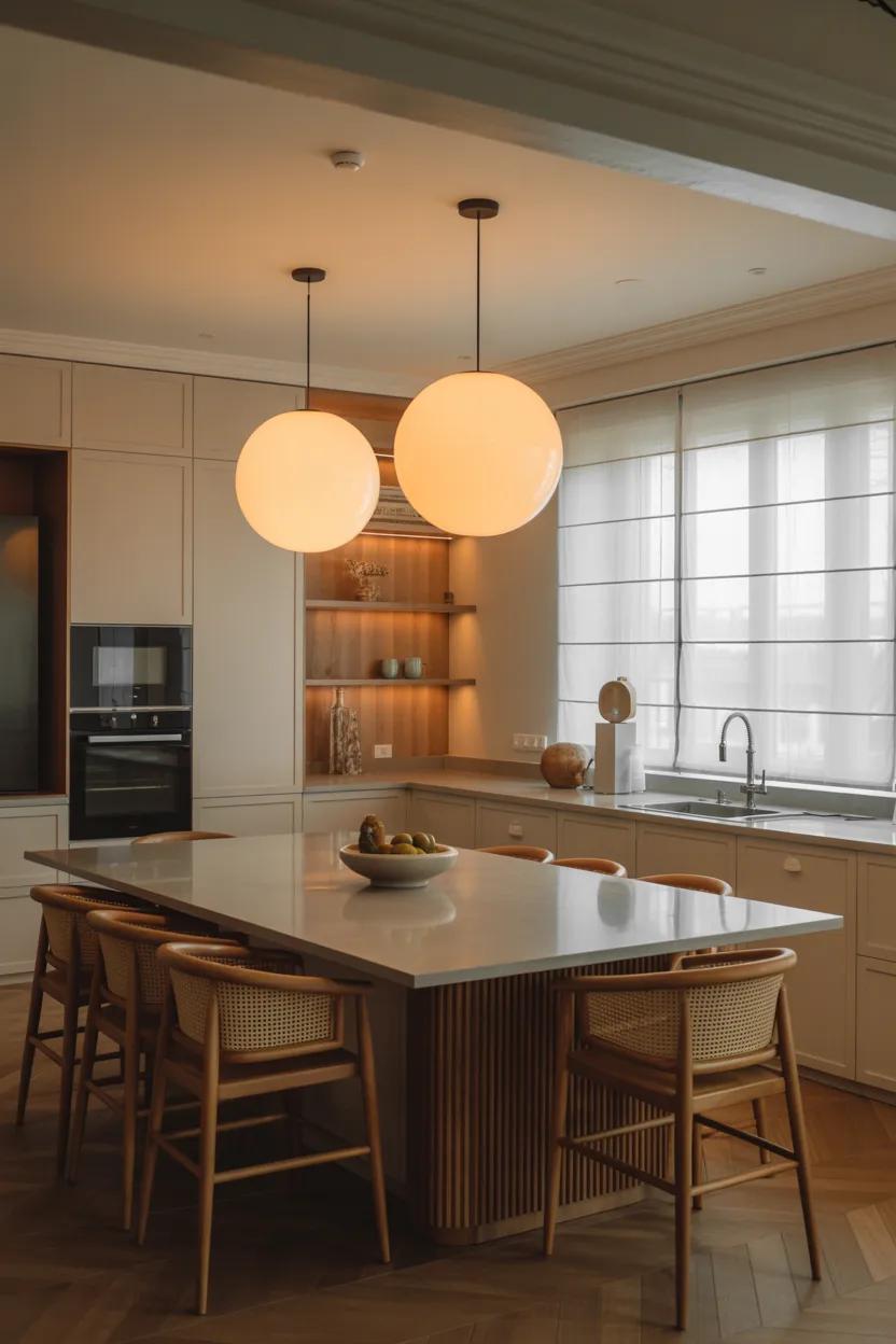 Pendant lights do more than add brightness. They shape the mood of the kitchen and help define the island area. Oversized pendants make a stronger statement, and they fill the room in a way that smaller fixtures often cannot.