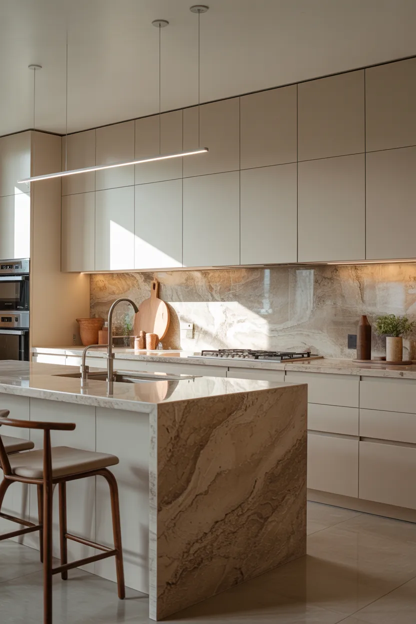 Warm stone tones work especially well here because they keep the space from feeling too cold or flat. Full-height slabs also show off beautiful veining and natural movement. That gives the kitchen style without needing extra decoration.