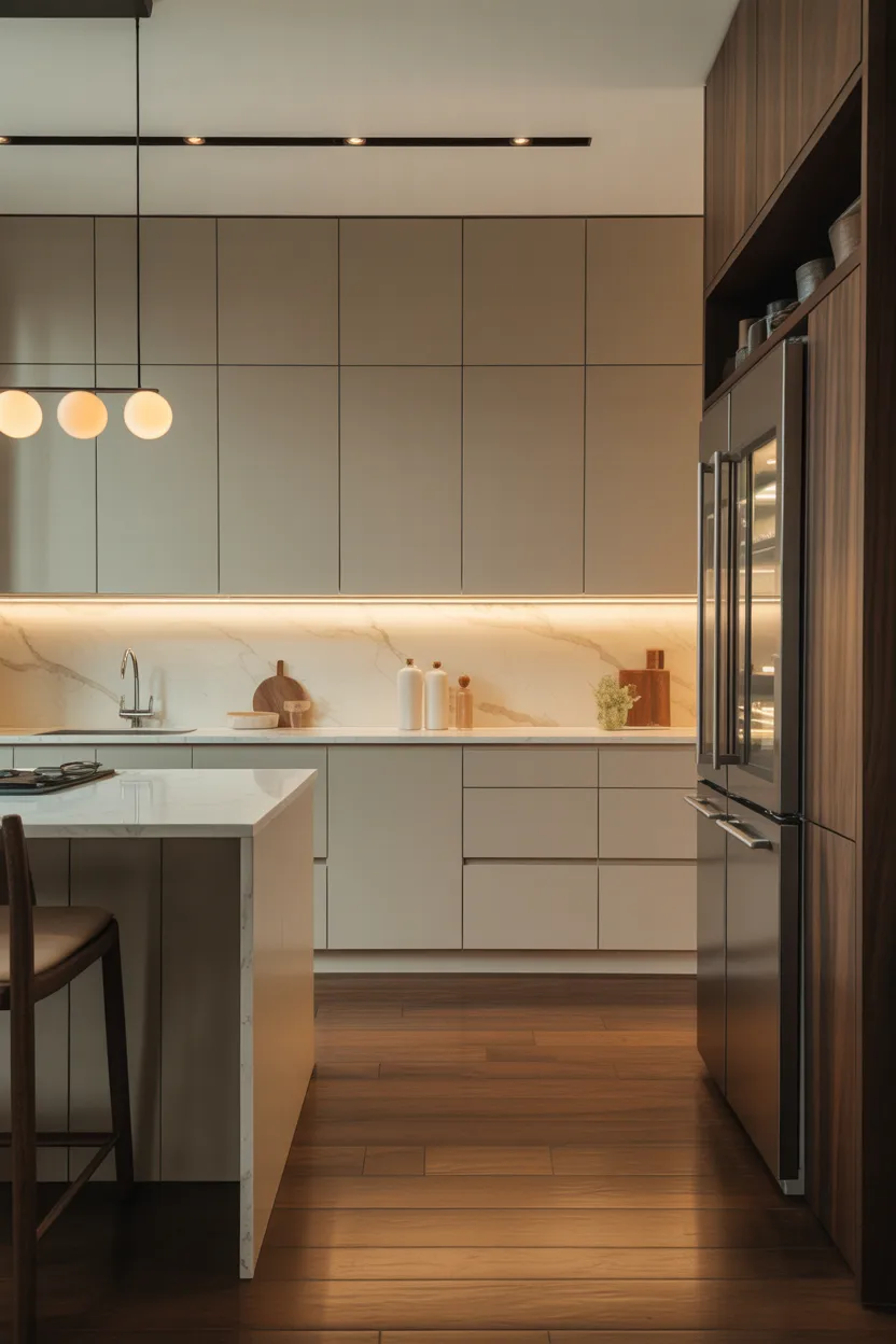 Integrated appliances help the kitchen feel seamless. When the refrigerator and dishwasher blend into the cabinetry, the whole room looks cleaner and more custom. That smooth visual flow instantly makes the space feel more high-end.
