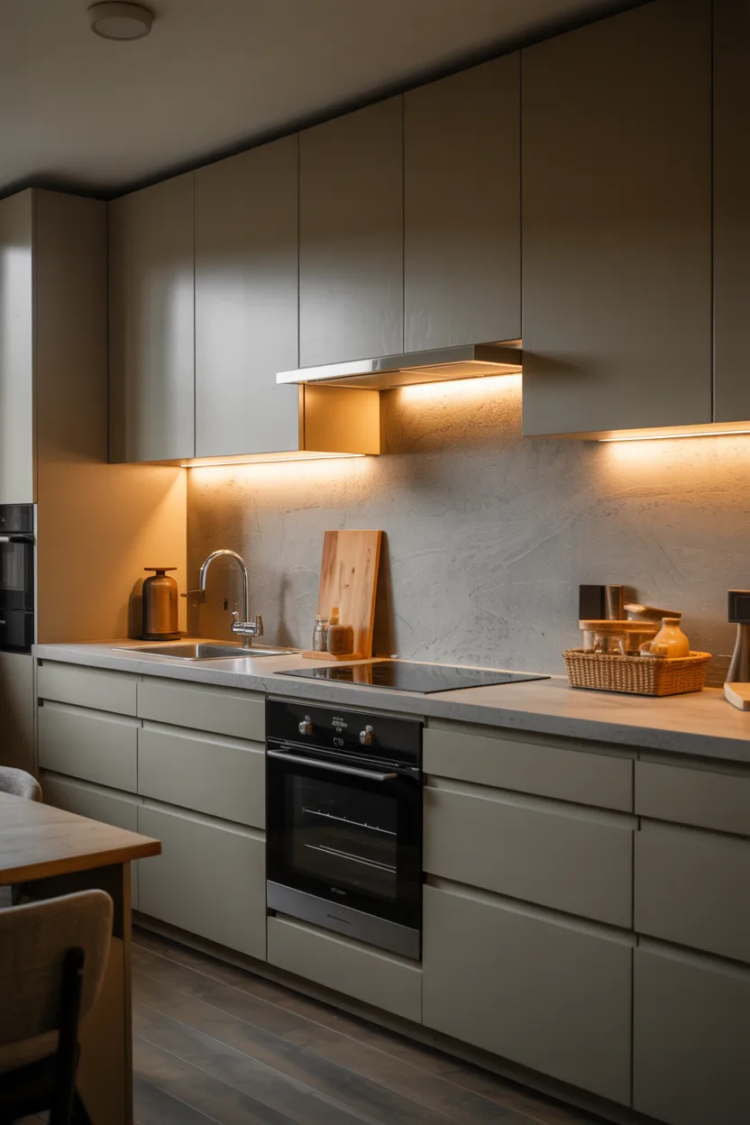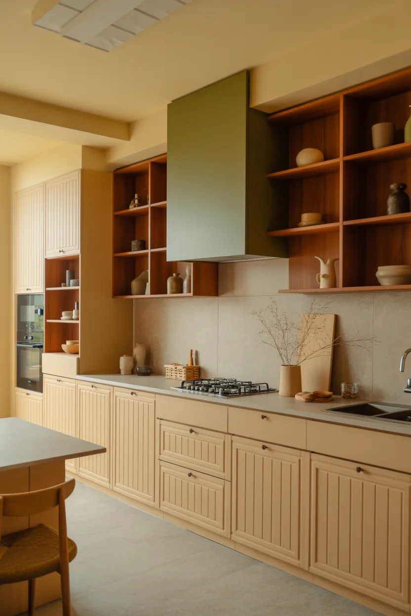 Color trends in modern kitchen ideas 2026 lean warmer and more natural. Soft beige, clay, mushroom, sand, and muted olive all create a gentle, grounded look. These shades feel current, but they also feel easy to live with.