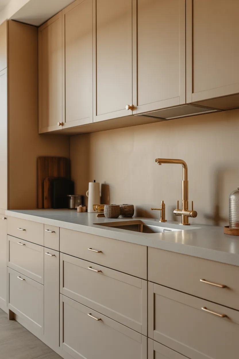 I like greige because it works with so many materials. It looks great with warm wood, black hardware, brass accents, and natural stone. You can build around it without feeling boxed into one specific style.