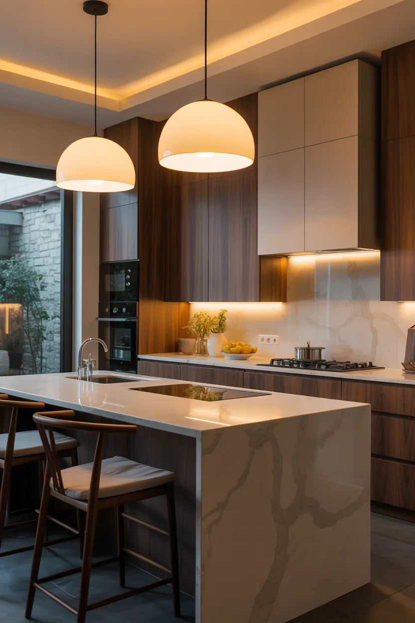 I like this idea because it blends style and practicality. A warm-toned waterfall island looks refined, and it also stands up well to daily use. And yes, it does make the space feel a little more high-end, which nobody complains about.