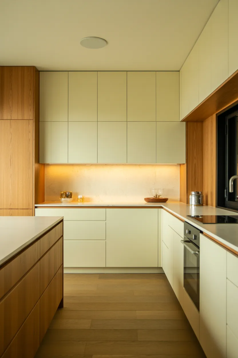 I would pick creamy white over stark white almost every time for a warm modern kitchen. Warm white cabinets pair beautifully with wood, brass, stone, and soft neutral walls. It is a simple shift, but it makes the room feel much more relaxed.
