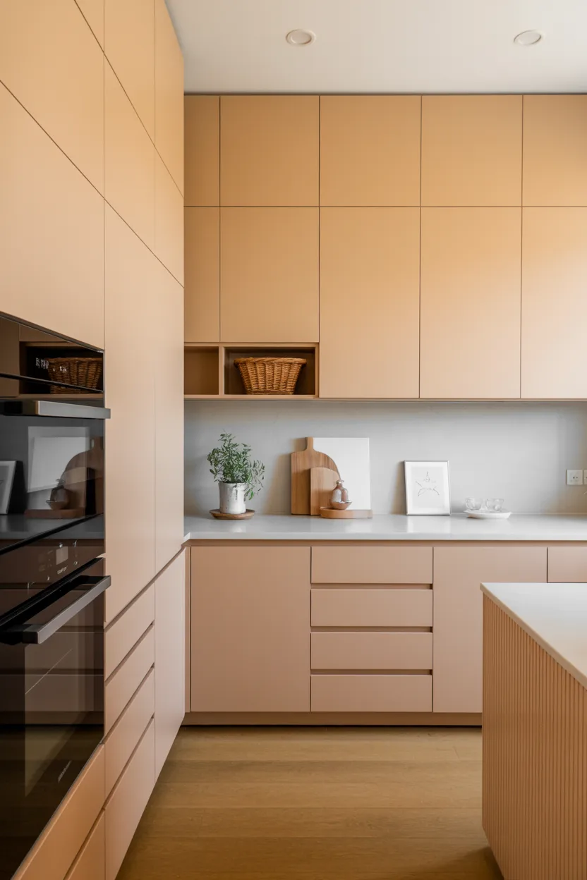 High gloss cabinets can look modern, but matte finishes usually feel more relaxed and elegant. They soften the room and reduce glare, which helps the kitchen feel calmer. That small texture shift changes the whole mood.