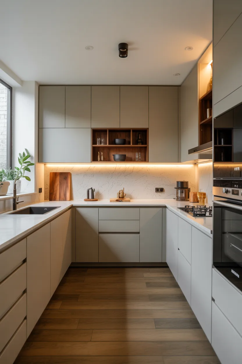 Start with recessed ceiling lights for general brightness. Then add pendant lights over the island, under-cabinet lighting for work zones, and maybe a sconce or two if the layout allows it. Each light source adds depth and makes the room feel more complete.