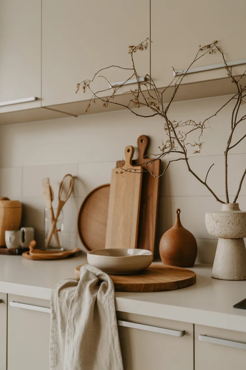 A warm modern kitchen does not need clutter. It needs a few simple pieces that feel useful, natural, and intentional. Think wood cutting boards, ceramic bowls, linen towels, and a stone vase with branches.