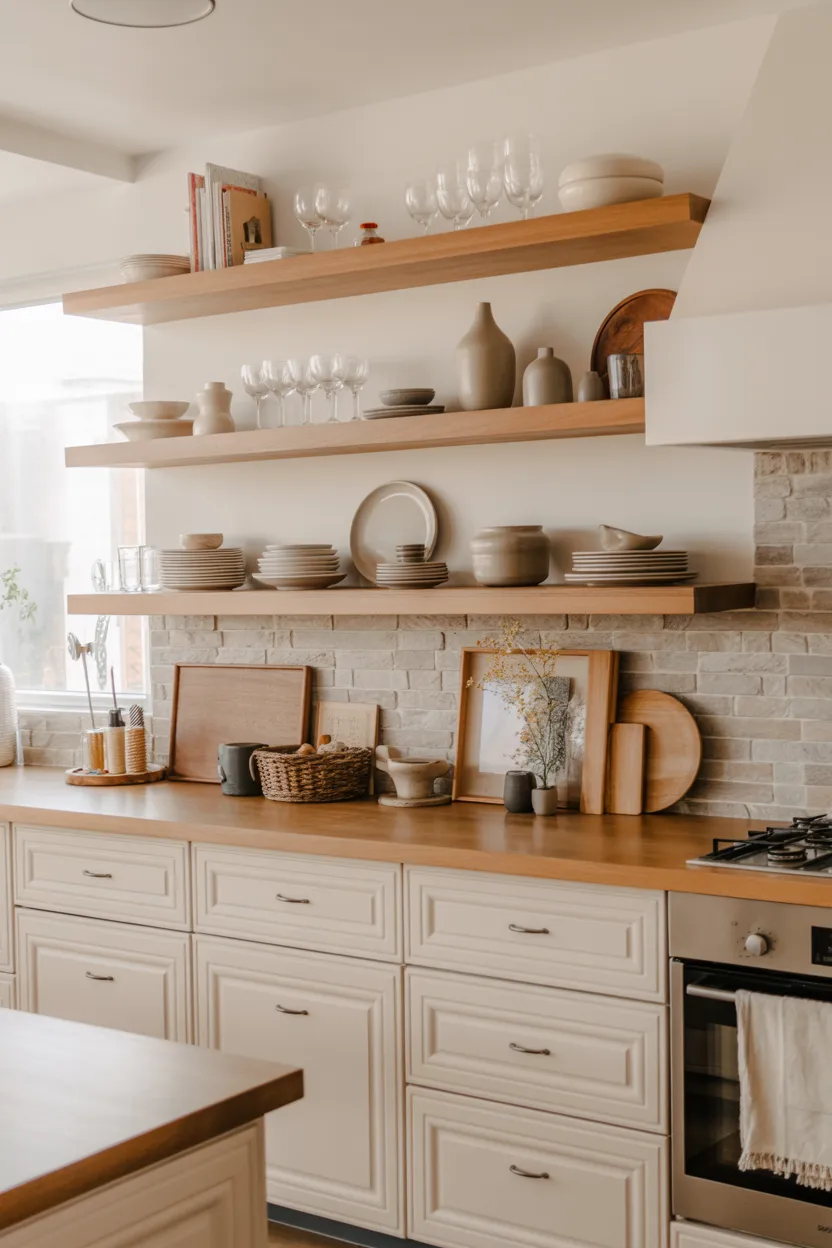 Open shelving can look beautiful when you use it carefully. It adds airiness and gives you a place to display pretty dishes, glassware, or a few warm decorative pieces. The key is knowing when to stop.