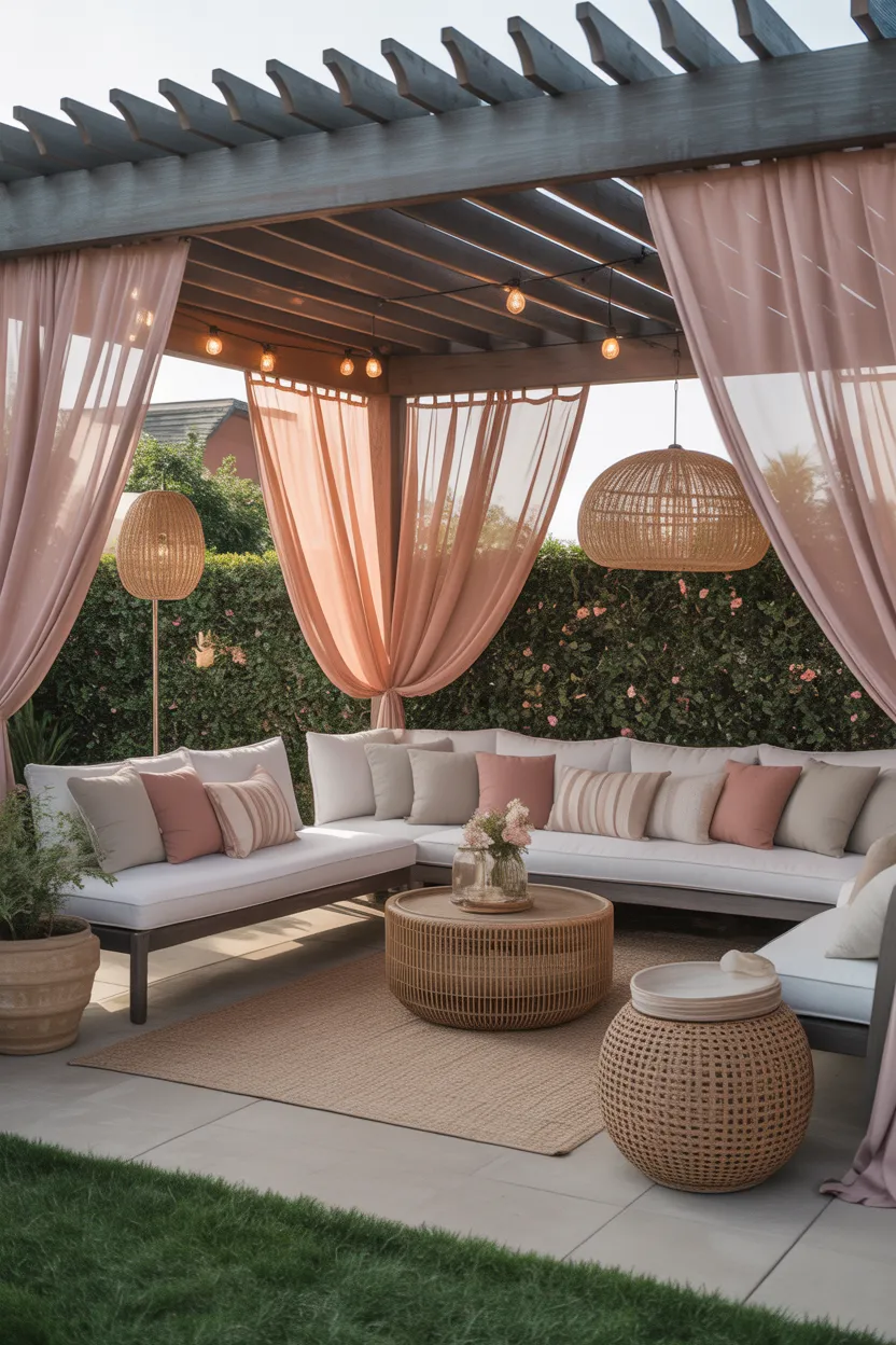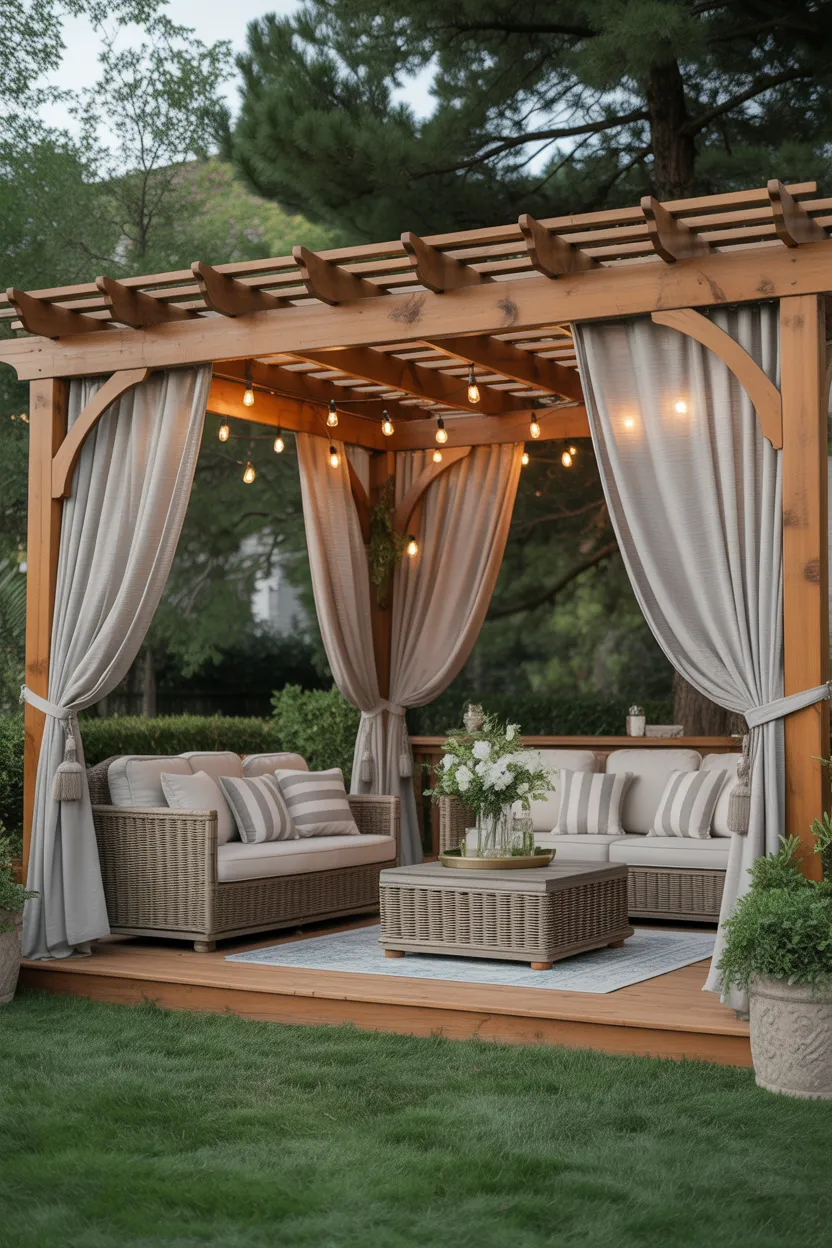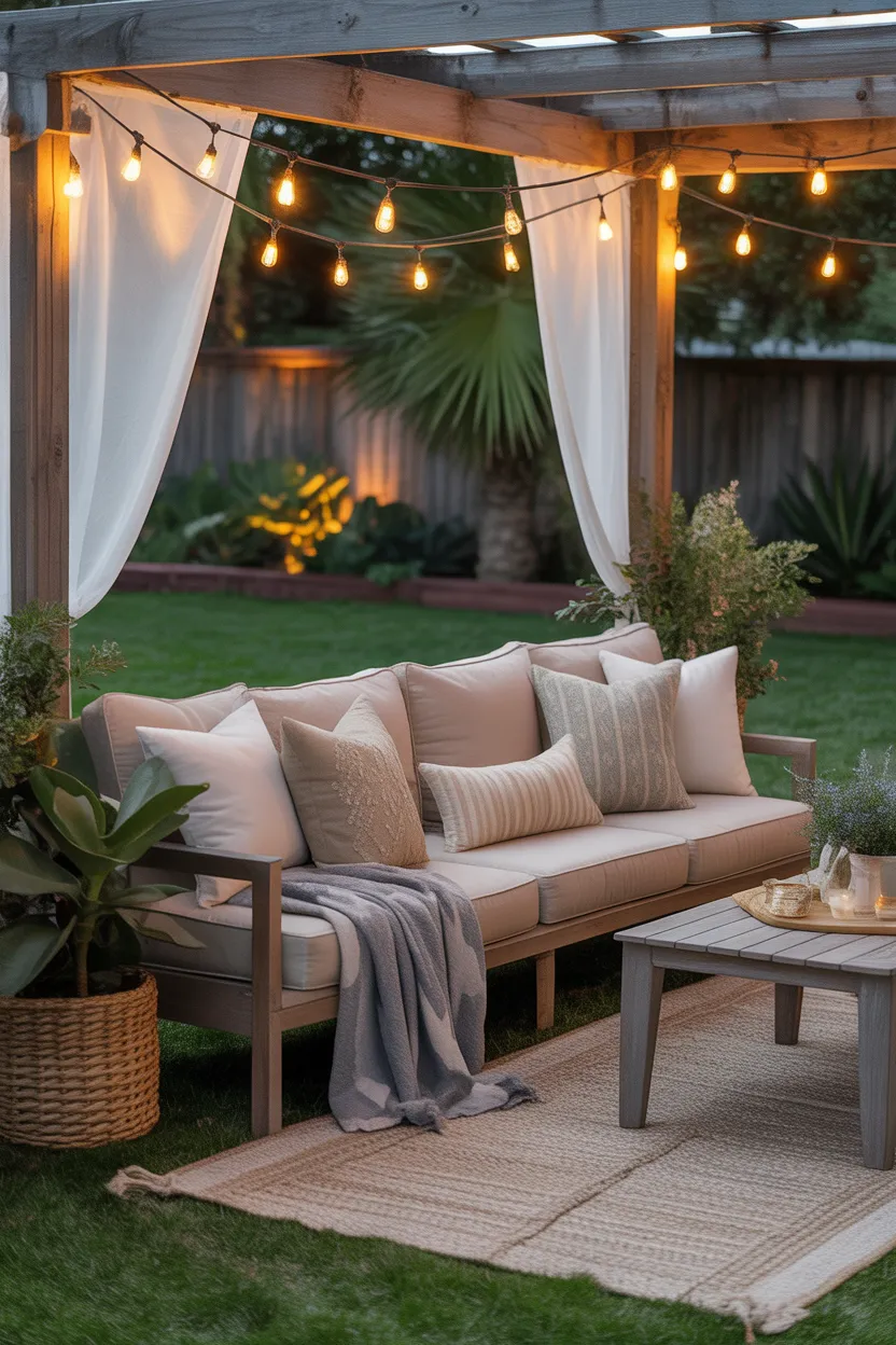 Hang curtains from a pergola, gazebo, or covered patio frame. Choose light outdoor fabric if you want an airy look, or go with slightly heavier material if you want more privacy and shade. I love this idea because it instantly makes the lounge feel more finished.