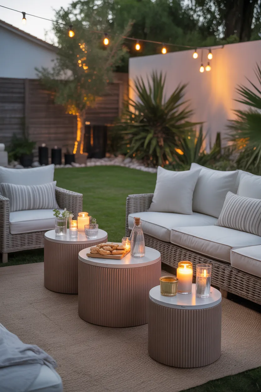 This detail matters in every kind of outdoor party lounge. You do not need huge tables either. Compact, sturdy surfaces work perfectly as long as they are within easy reach.