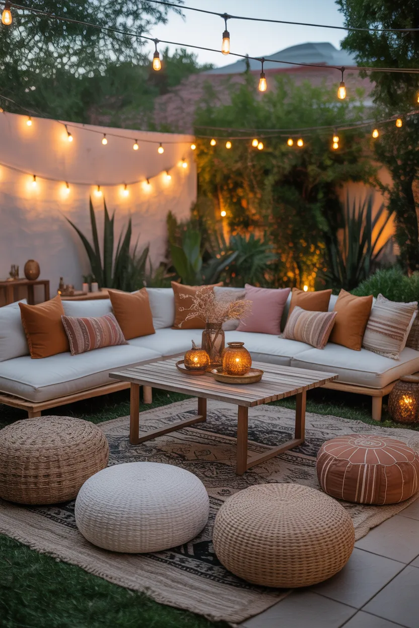 A boho-style lounge feels relaxed, layered, and full of personality. It works especially well if you want your outdoor setup to feel casual and creative instead of overly polished.