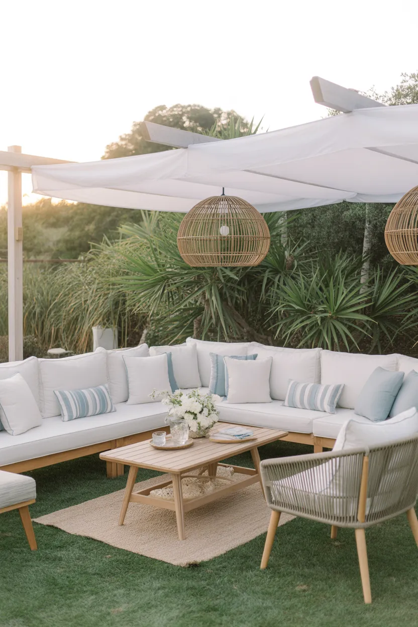 Use light cushions, woven textures, pale wood tones, and soft blue or sandy beige accents. I like coastal design because it feels clean without looking cold. It gives your backyard a calm look that still feels welcoming when people come over.