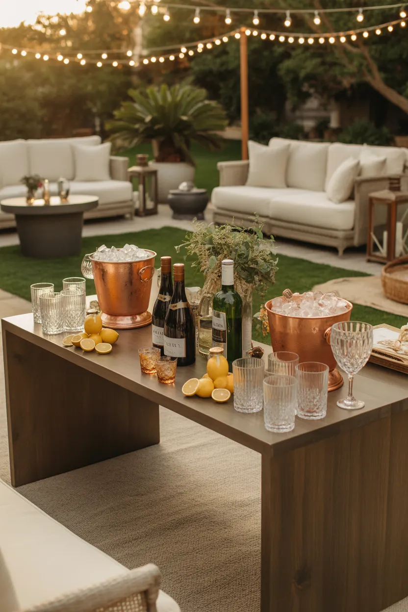Use a side table, outdoor cabinet, or console to hold drinks, cups, ice, and garnishes. Keep water, sparkling drinks, and a few simple options available so guests can help themselves. I always think this kind of station makes the whole event feel more relaxed.