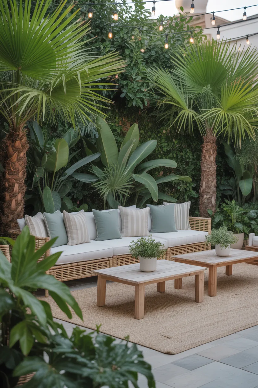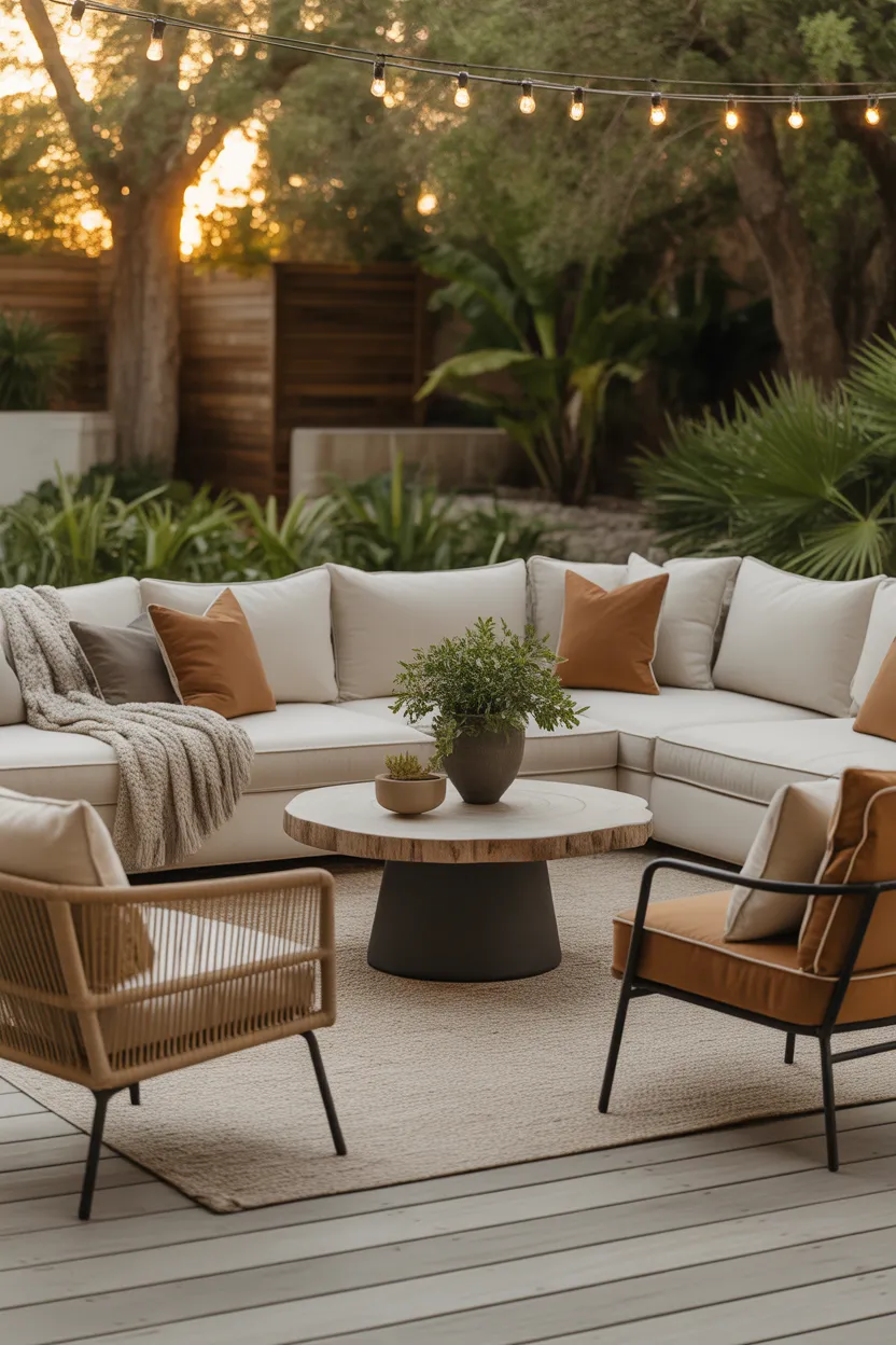 Try large potted palms, ornamental grasses, olive trees, trailing greenery, or flowering containers depending on your climate and style. I like using a mix of tall and low plants because it makes the space feel layered. It also helps frame the seating area more naturally.
