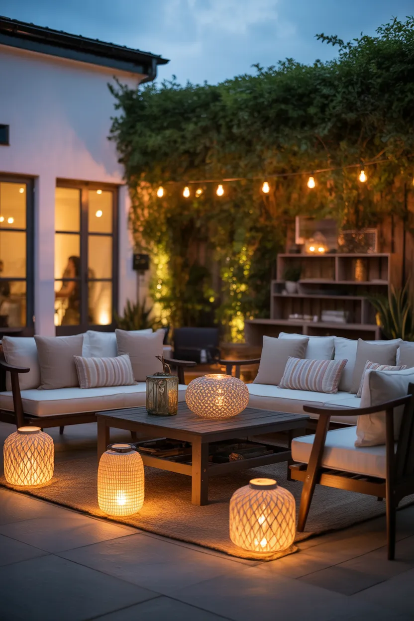 Place lanterns on side tables, the ground near the seating area, or along nearby pathways. I like mixing sizes because it makes the space look more styled without needing much effort. You can use candle-style lanterns, battery-powered versions, or modern metal designs depending on your overall look.